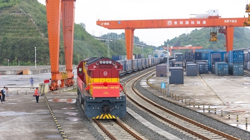 8月19日,貴州首趟多式聯(lián)運(yùn)“一單制”班列從貴陽(yáng)國(guó)際陸港都拉營(yíng)站出發(fā)(無(wú)人機(jī)照片)。