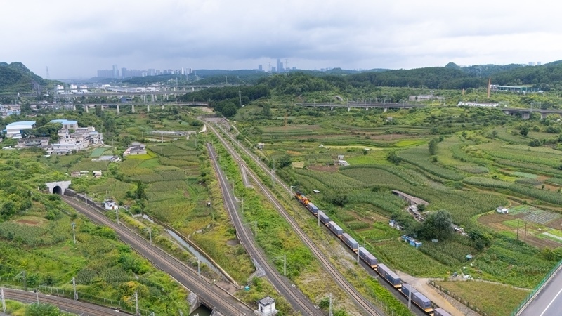8月19日,貴州首趟多式聯(lián)運(yùn)“一單制”班列駛出貴陽(yáng)國(guó)際陸港都拉營(yíng)站(無(wú)人機(jī)照片)。