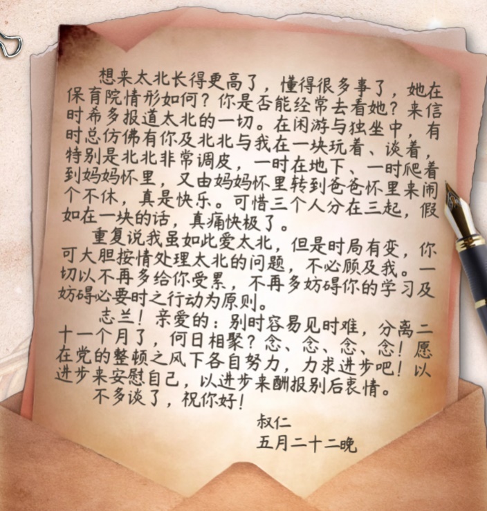 在信的最后,左權(quán)不得不忍痛交代妻子:“我雖如此愛太北,但是時局有變,你可大膽按情處理太北的問題,不必顧及我?!辈⒚銊钇拮右赃M步來安慰自己,以進步來酬報別后衷情。