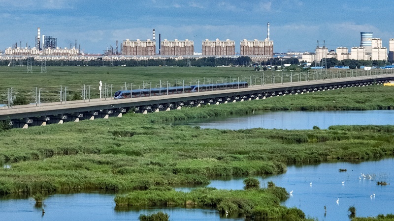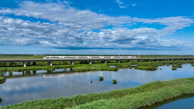 8月17日,復(fù)興號(hào)動(dòng)車組列車行駛在哈齊高鐵線上(無(wú)人機(jī)照片)。