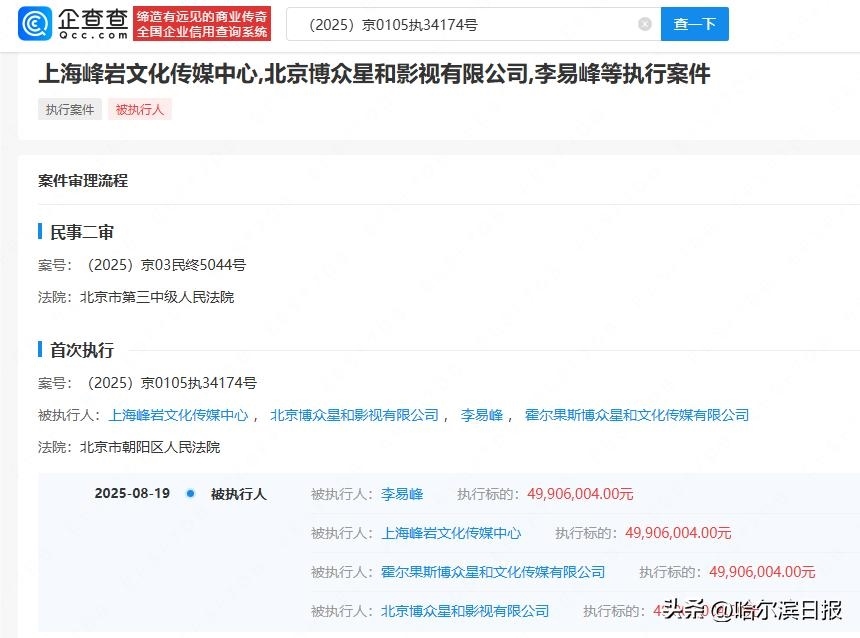 8月21日,記者從企查查獲悉,近日,李易峰、上海峰巖文化傳媒中心、北京博眾星和影視有限公司等被北京市朝陽區(qū)人民法院強(qiáng)制執(zhí)行約4990萬元。其中,上海峰巖文化傳媒中心成立于2018年,由李易峰個人出資。