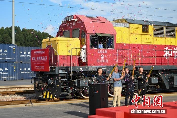 2024年10月14日,首趟滿(mǎn)載老撾進(jìn)口香蕉的中老鐵路“京滇 瀾湄線”國(guó)際貨運(yùn)列車(chē)從云南省昆明市王家營(yíng)西站駛出,標(biāo)志著中老鐵路國(guó)際冷鏈班列暨“京滇 瀾湄線”國(guó)際貨運(yùn)列車(chē)正式開(kāi)行。中新社記者 李嘉嫻 攝