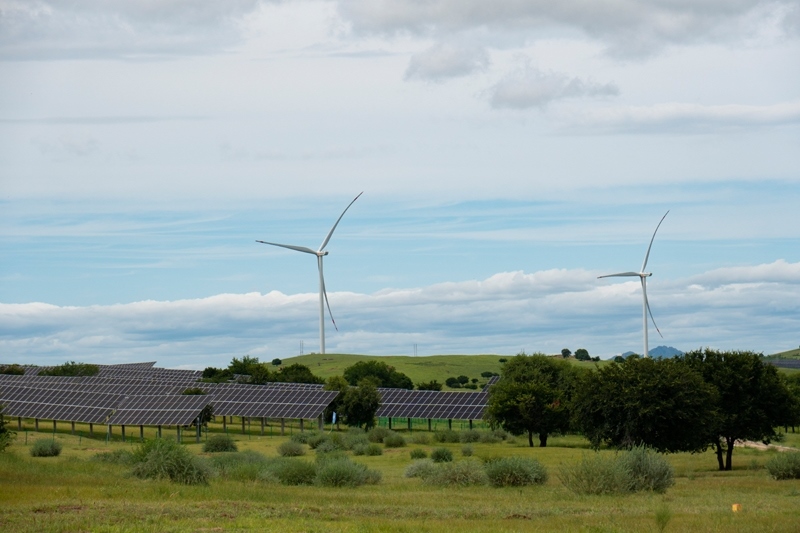在內(nèi)蒙古興安盟中廣核科右中旗防沙治沙和風(fēng)電光伏一體化項(xiàng)目場(chǎng)地拍攝的風(fēng)機(jī)和光伏陣列(7月29日攝)。
