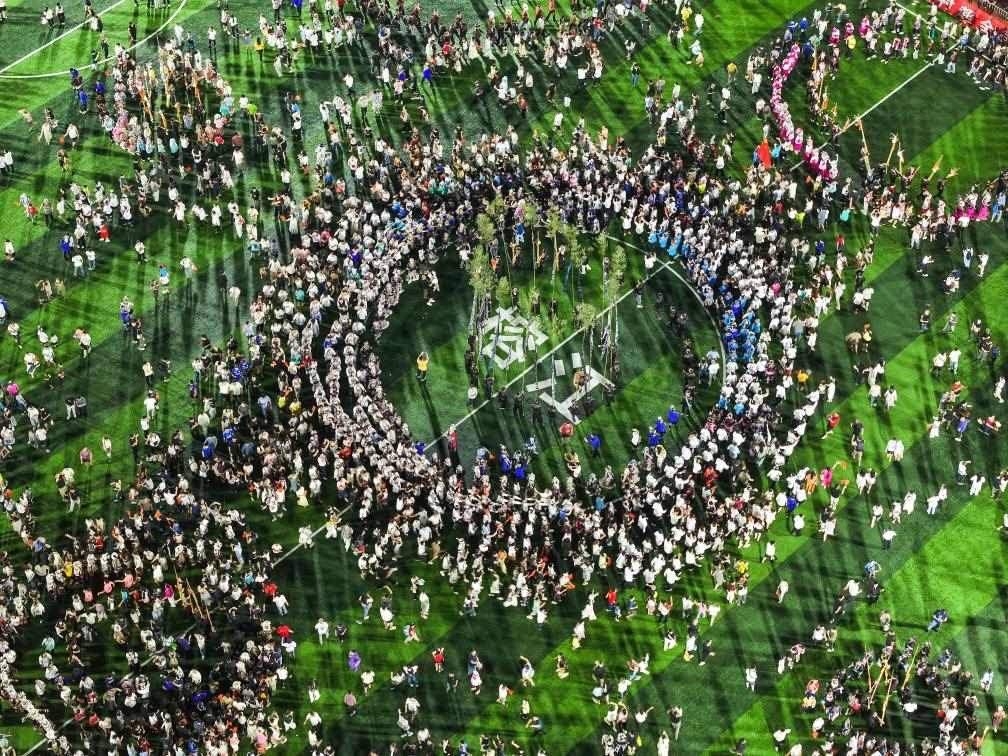 8月23日,人們在貴州“村超”球場跳苗族蘆笙舞(無人機(jī)照片)。新華社記者 楊文斌 攝
