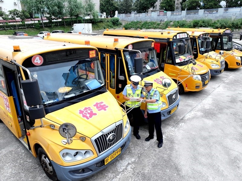 8月25日,江蘇省淮安市公安局洪澤分局交警大隊(duì)民警對校車進(jìn)行安全檢查。