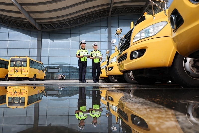 8月25日,湖北省襄陽市??悼h公安局交警大隊(duì)民警對校車進(jìn)行安全檢查(無人機(jī)照片)。