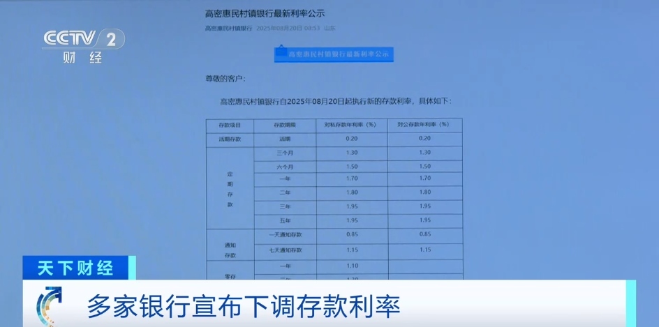 8月20日,山東省高密惠民村鎮(zhèn)銀行公告,個(gè)人定期存款6個(gè)月、1年期、2年期的年利率均下調(diào)10個(gè)基點(diǎn),3年期、5年期則下調(diào)20個(gè)基點(diǎn)。