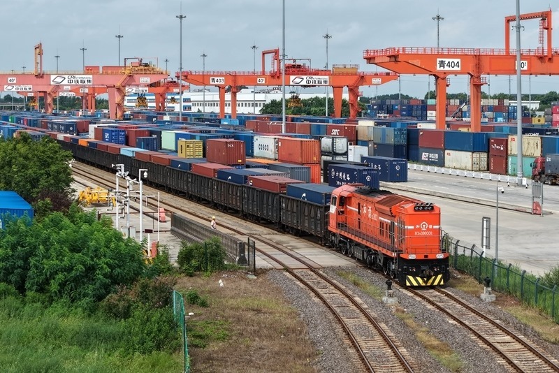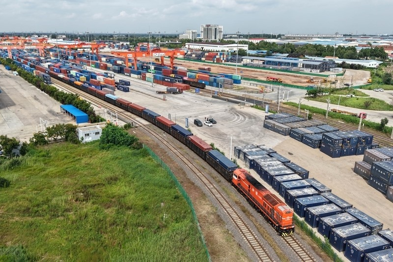 8月27日,一列貨運列車駛入位于上合示范區(qū)內(nèi)的中國-上海合作組織地方經(jīng)貿(mào)合作示范區(qū)多式聯(lián)運中心(無人機照片)。