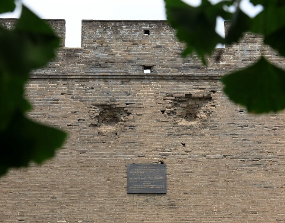 宛平城城墻上的彈坑遺跡。新華社記者 張晨霖 攝