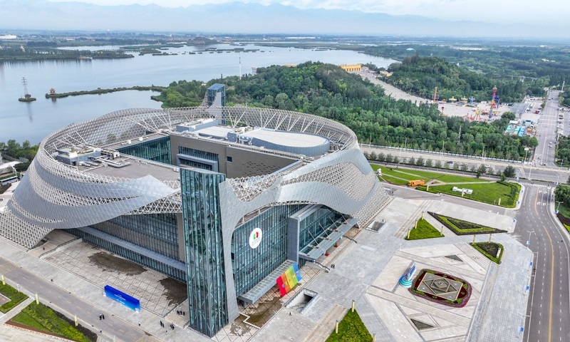 這是8月28日在寧夏銀川市拍攝的第七屆中國—阿拉伯國家博覽會(huì)開幕式舉辦地——寧夏國際會(huì)堂外景(無人機(jī)照片)。