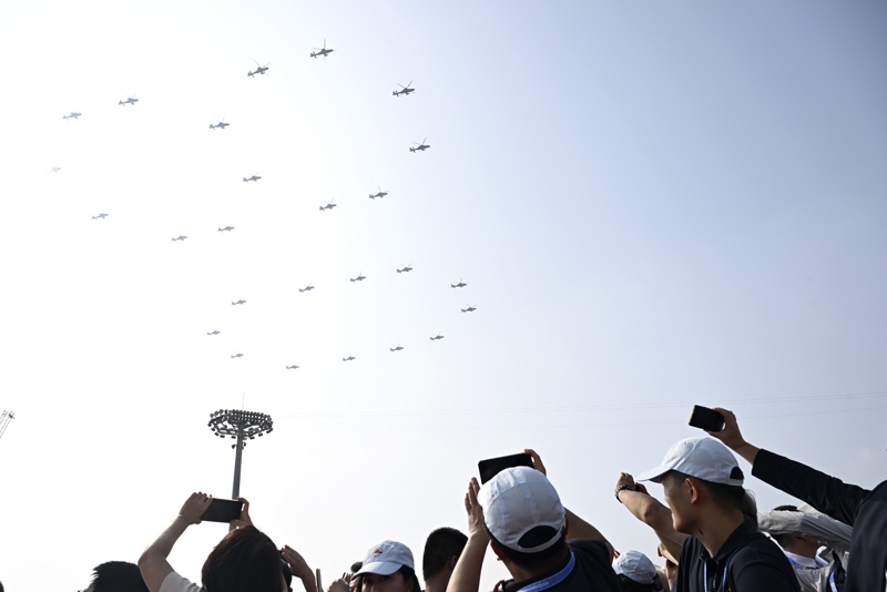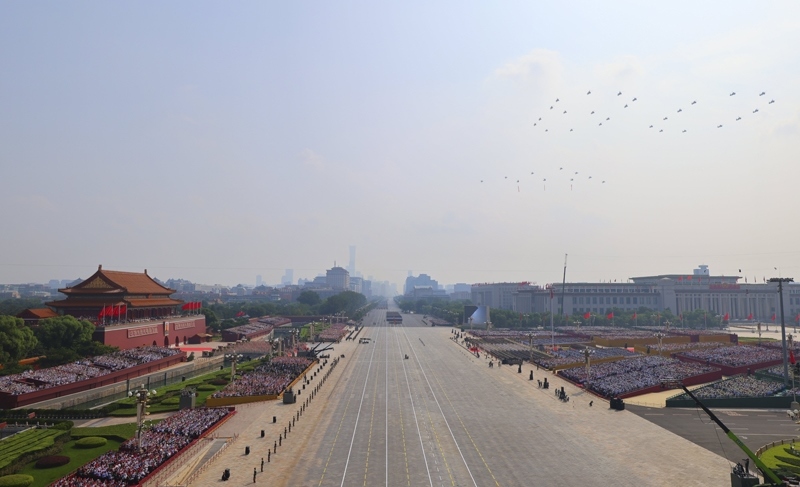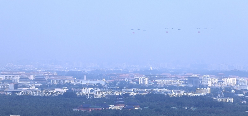 9月3日,紀念中國人民抗日戰(zhàn)爭暨世界反法西斯戰(zhàn)爭勝利80周年大會在北京隆重舉行。這是空中護旗梯隊。