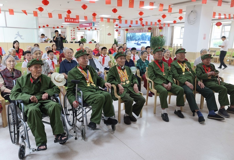 9月3日,在位于山東省臨沂市沂南縣大莊鎮(zhèn)的“山東抗戰(zhàn)老兵照護(hù)中心”,老兵們和志愿者、少先隊(duì)員一起觀看紀(jì)念中國人民抗日戰(zhàn)爭暨世界反法西斯戰(zhàn)爭勝利80周年大會直播。