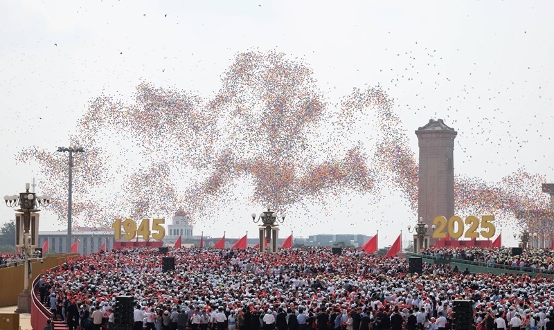 9月3日,紀(jì)念中國人民抗日戰(zhàn)爭(zhēng)暨世界反法西斯戰(zhàn)爭(zhēng)勝利80周年大會(huì)在北京隆重舉行。這是紀(jì)念大會(huì)現(xiàn)場(chǎng)放飛氣球。