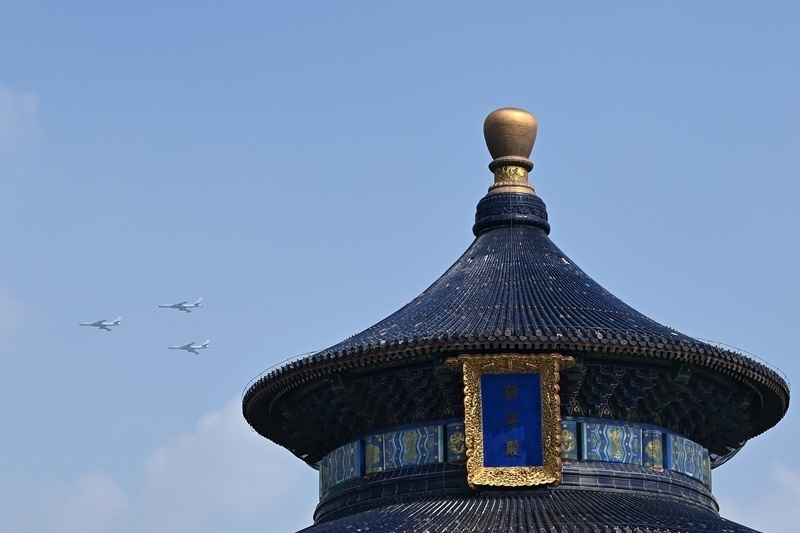 9月3日,紀念中國人民抗日戰(zhàn)爭暨世界反法西斯戰(zhàn)爭勝利80周年大會在北京隆重舉行。這是在北京天壇公園拍攝的轟炸機梯隊。