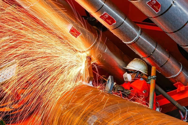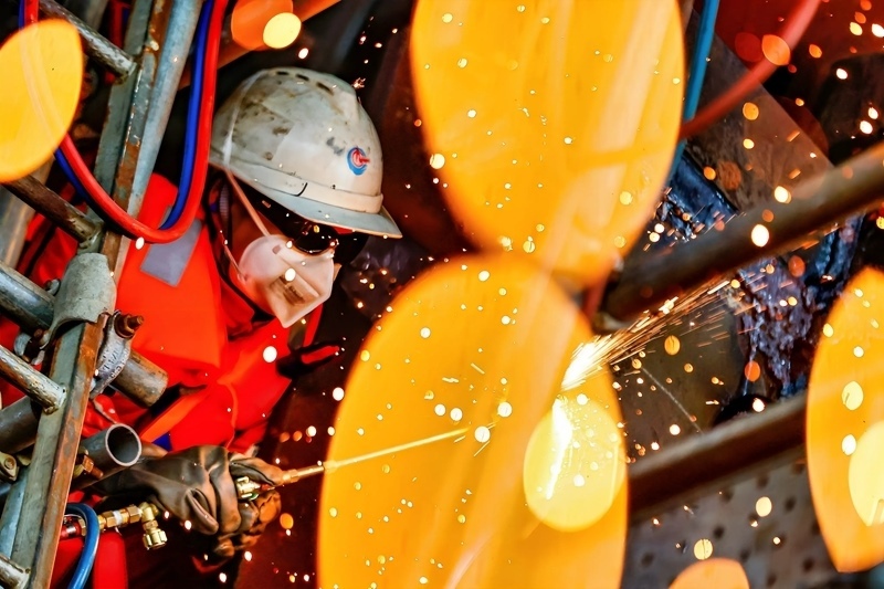 9月8日,工人在墾利6-1油田10-1北區(qū)塊Ⅱ期開發(fā)項目油氣平臺安裝作業(yè)現(xiàn)場進(jìn)行切割作業(yè)。