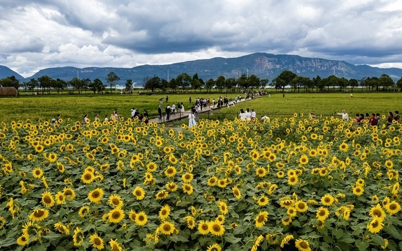 10月4日,游客在昆明滇池邊的福保村欣賞向日葵(無人機照片)。