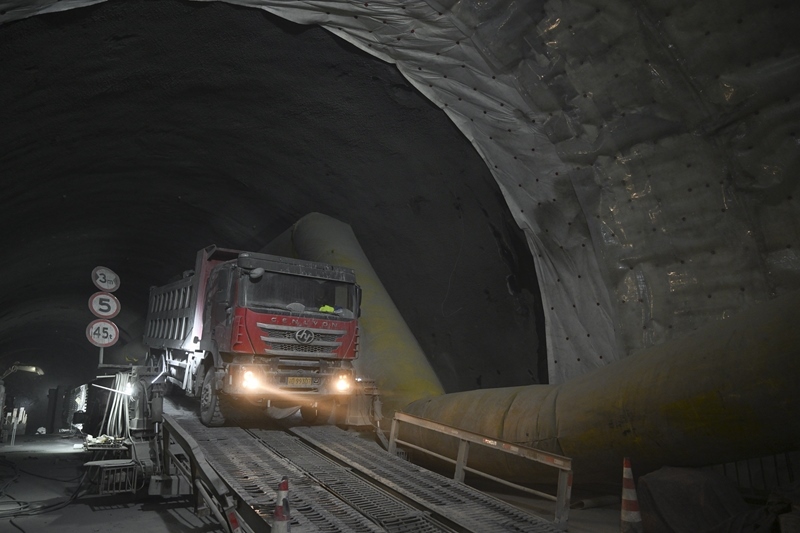 施工車輛行駛在昭溫公路西天山特長隧道右洞內(10月5日攝)。