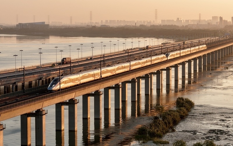 10月10日,在江蘇省昆山市,動車組列車通過京滬高鐵丹昆特大橋陽澄湖段(無人機照片)。
