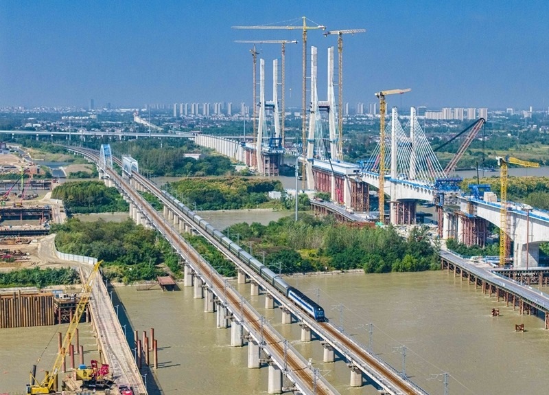 10月10日,列車行駛在寧啟鐵路江蘇揚州段(無人機照片)。