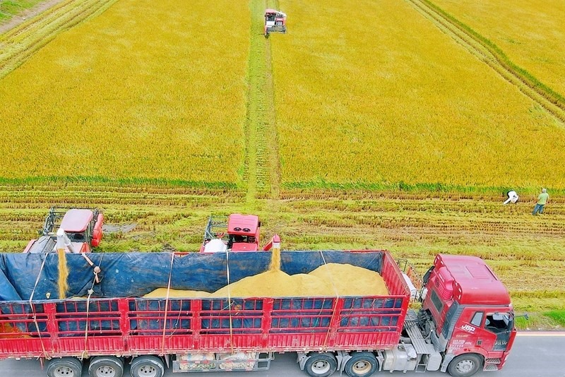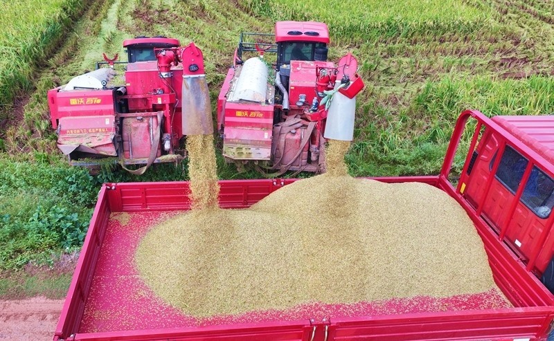 10月17日,在湖南省永州市道縣梅花鎮(zhèn)梅花村,水稻種植大戶采用大型機械收獲稻谷(無人機照片)。