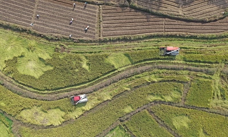 10月17日,在浙江省臺州市仙居縣雙廟鄉(xiāng),農(nóng)機手駕駛農(nóng)機收割晚稻(無人機照片)。