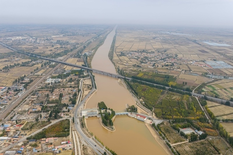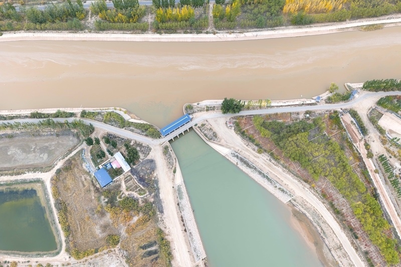 10月16日,用于灌溉的黃河水流經內蒙古巴彥淖爾市臨河區(qū)境內的總干渠第二分水樞紐(無人機照片)。