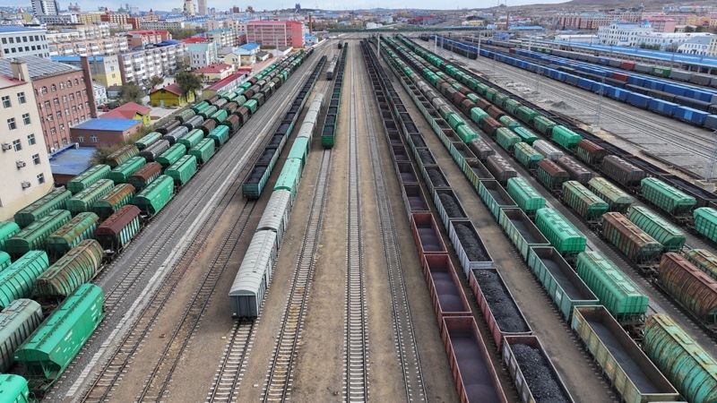 10月18日,在中國鐵路哈爾濱局集團(tuán)有限公司滿洲里站,機(jī)械化換裝場(chǎng)在對(duì)進(jìn)口貨物進(jìn)行換裝作業(yè)(無人機(jī)照片)。