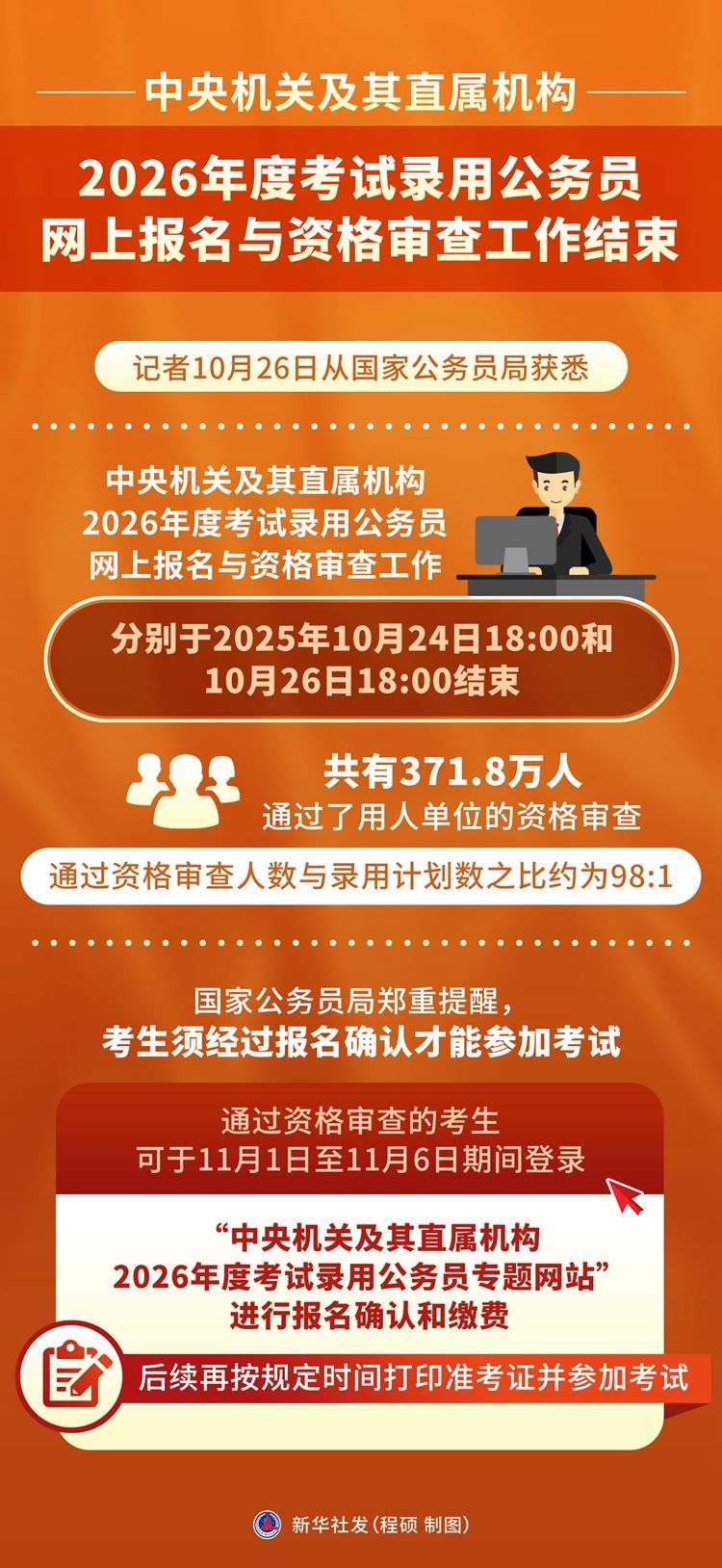新華社北京10月26日電(記者范思翔)記者26日從國家公務(wù)員局獲悉,中央機(jī)關(guān)及其直屬機(jī)構(gòu)2026年度考試錄用公務(wù)員網(wǎng)上報(bào)名與資格審查工作分別于2025年10月24日18:00和10月26日18:00結(jié)束,共有371.8萬人通過了用人單位的資格審查,通過資格審查人數(shù)與錄用計(jì)劃數(shù)之比約為98:1。