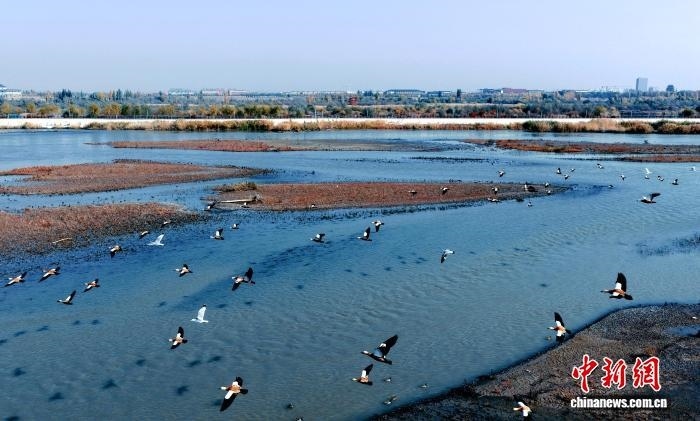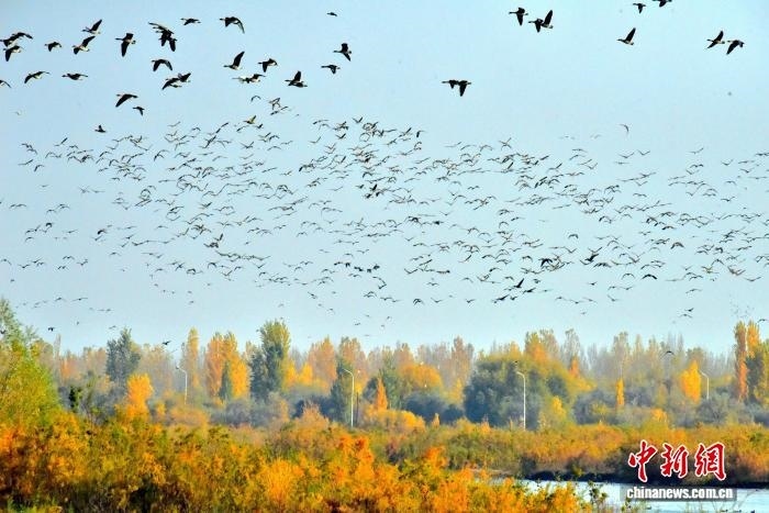 中新網(wǎng)烏魯木齊10月28日電 (黨艷麗)深秋時節(jié),成群結(jié)隊的灰雁“到訪”新疆可克達拉市。它們或飛翔在湛藍的天空上,發(fā)出陣陣鳴叫聲;或集結(jié)在伊犁河可克達拉市段河畔,補給“能量”,為接下來的遷徙旅程做足準備。