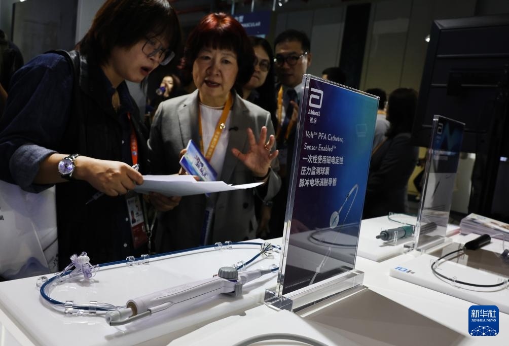 11月6日,參觀者在雅培公司一款磁電定位壓力監(jiān)測球囊脈沖電場消融導(dǎo)管展品前駐足觀看,這是該產(chǎn)品的亞洲首展。