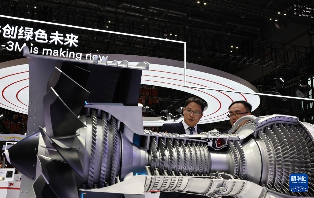 11月5日,參觀者在通用電氣展臺展出的一款LEAP-1C發(fā)動機(jī)模型前交流討論,這也是該型號發(fā)動機(jī)的中國首展。