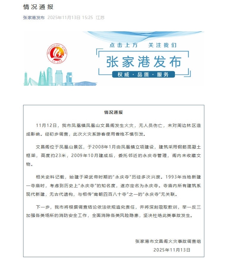 通報稱,文昌閣位于鳳凰山景區(qū),于2008年1月由鳳凰鎮(zhèn)立項建設,建筑采用鋼筋混凝土框架,高度約23米,2009年10月建成后,委托鄰近的永慶寺管理,閣內(nèi)未收藏文物。