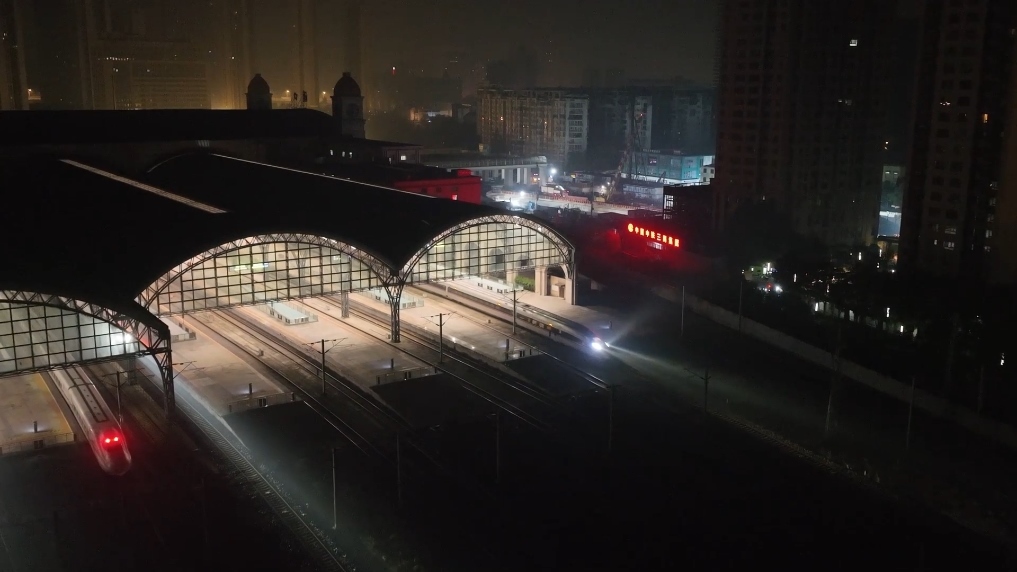 15日凌晨5時,漢口站站臺上,已裝袋的服裝、生鮮、電子產品等10噸快件有序擺放,鐵路工作人員正將包裹搬進高鐵車廂。