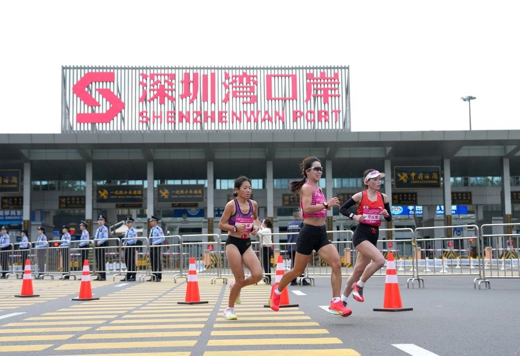 11月15日,第十五屆全國運(yùn)動(dòng)會田徑項(xiàng)目女子馬拉松比賽參賽選手經(jīng)過深圳灣口岸。新華社記者 丁增尼達(dá) 攝