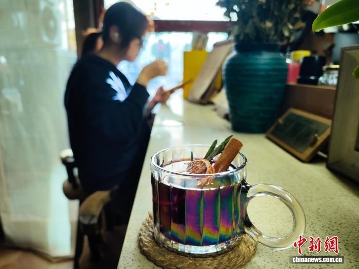 11月19日,在天津三七開(kāi)咖啡酒館,一款以紅酒為基底,搭配香橙清甜與肉桂醇香的熱飲熱銷(xiāo)?!≈行律缬浾?佟郁 攝