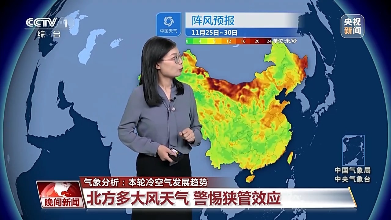 氣象分析師 孫倩倩:本周冷空氣頻繁,會導致各地氣溫多波動起伏,同時天氣干燥多風。眼下這輪冷空氣24日重點影響的是北方,尤其是在偏北的地區(qū)降溫是比較猛烈的。同時從內蒙古中部到河南山東一帶還伴隨著6級以上的大風,局部地區(qū)陣風達到了10~11級。