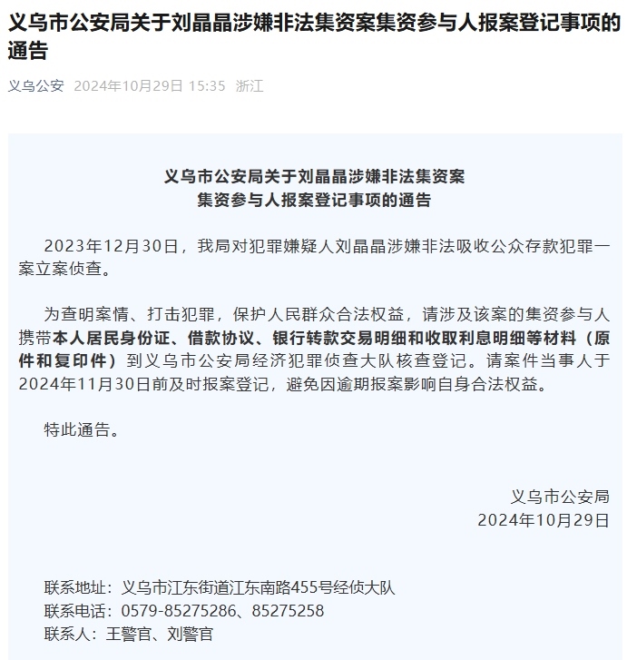 此前義烏公安也有在通告中公布嫌疑人全名的情況,例如2024年12月30日,其曾發(fā)布“關(guān)于劉晶晶涉嫌非法集資案集資參與人報案登記事項的通告”,亦是非法集資案,同樣公布嫌疑人全名。