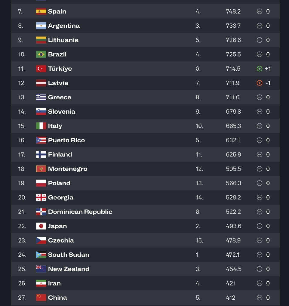 世界男籃前十名依舊為:美國、德國、塞爾維亞、法國、加拿大、澳大利亞、西班牙、阿根廷、立陶宛和巴西。土耳其超過拉脫維亞升至第11位,拉脫維亞降至第12位。