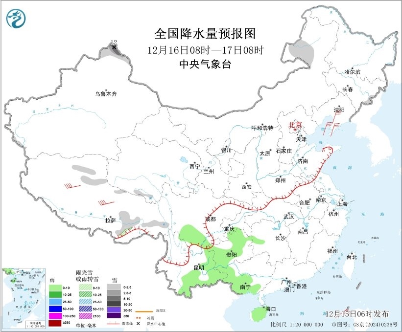 全國(guó)降水量預(yù)報(bào)圖(12月15日08時(shí)-16日08時(shí))