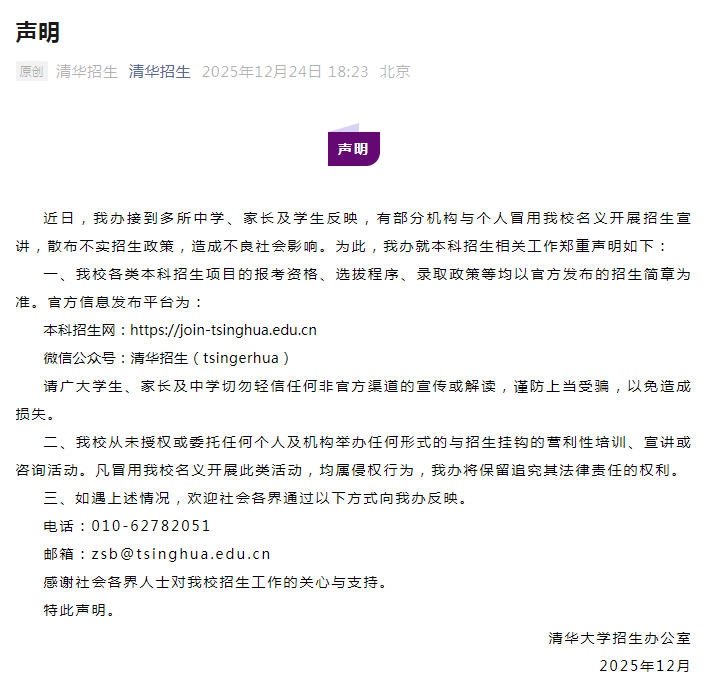 據(jù)“清華招生”微信公眾號消息,清華大學招生辦公室24日發(fā)布聲明稱,近日,清華大學招生辦公室接到多所中學、家長及學生反映,有部分機構(gòu)與個人冒用清華大學名義開展招生宣講,散布不實招生政策,造成不良社會影響。為此,清華大學招生辦公室就本科招生相關工作鄭重聲明如下: