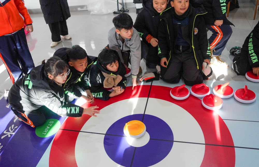 12月3日,吉林市松江東路小學校學生在吉林市納美山谷度假區(qū)體驗旱地冰壺。新華社記者 顏麟蘊 攝