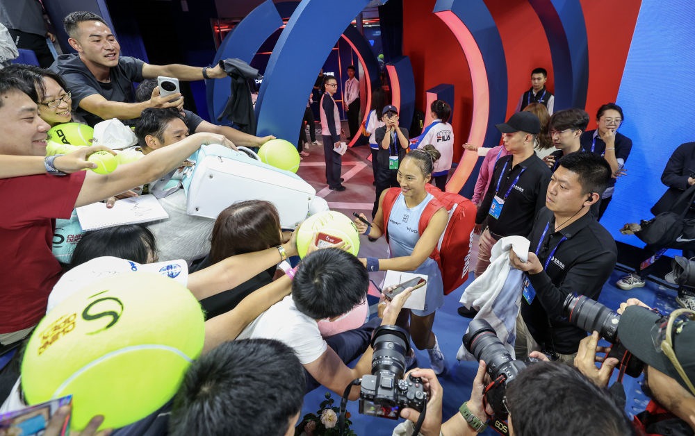 9月27日,在北京舉行的2025中國網(wǎng)球公開賽女單第二輪與哥倫比亞選手阿朗戈的比賽后,中國選手鄭欽文(中)與觀眾互動。新華社記者 白雪飛 攝