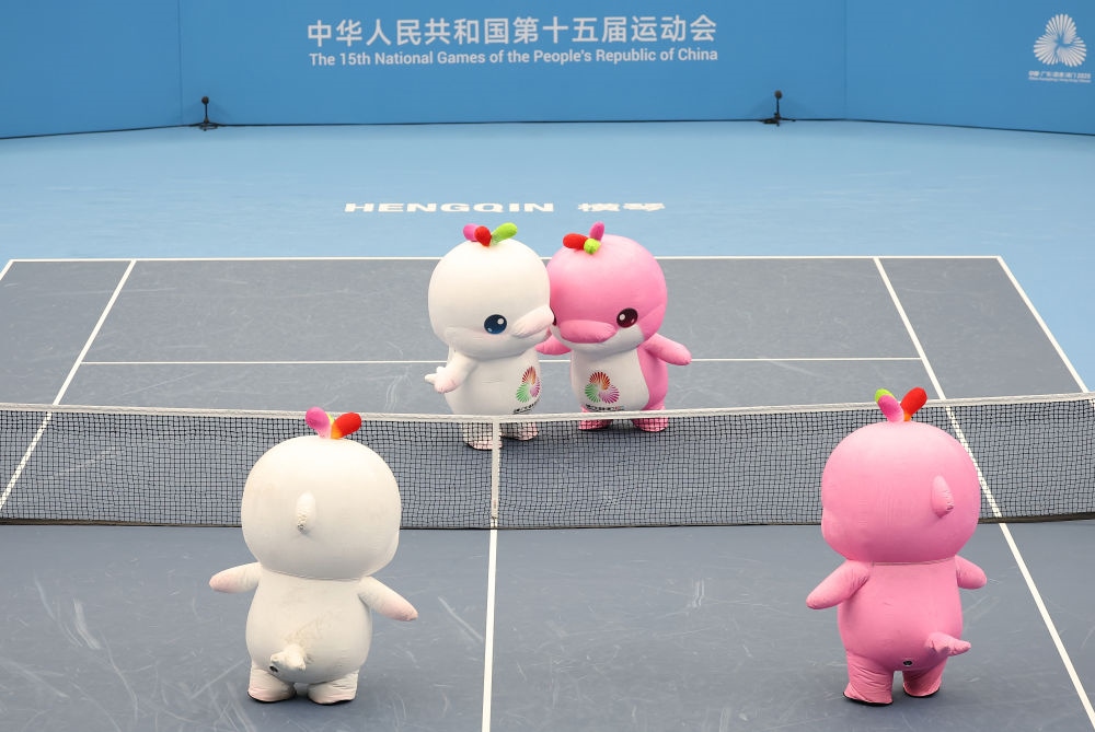 11月12日,第十五屆全國運動會吉祥物“喜洋洋”“樂融融”在網(wǎng)球比賽間隙表演。新華社記者 張晨霖 攝