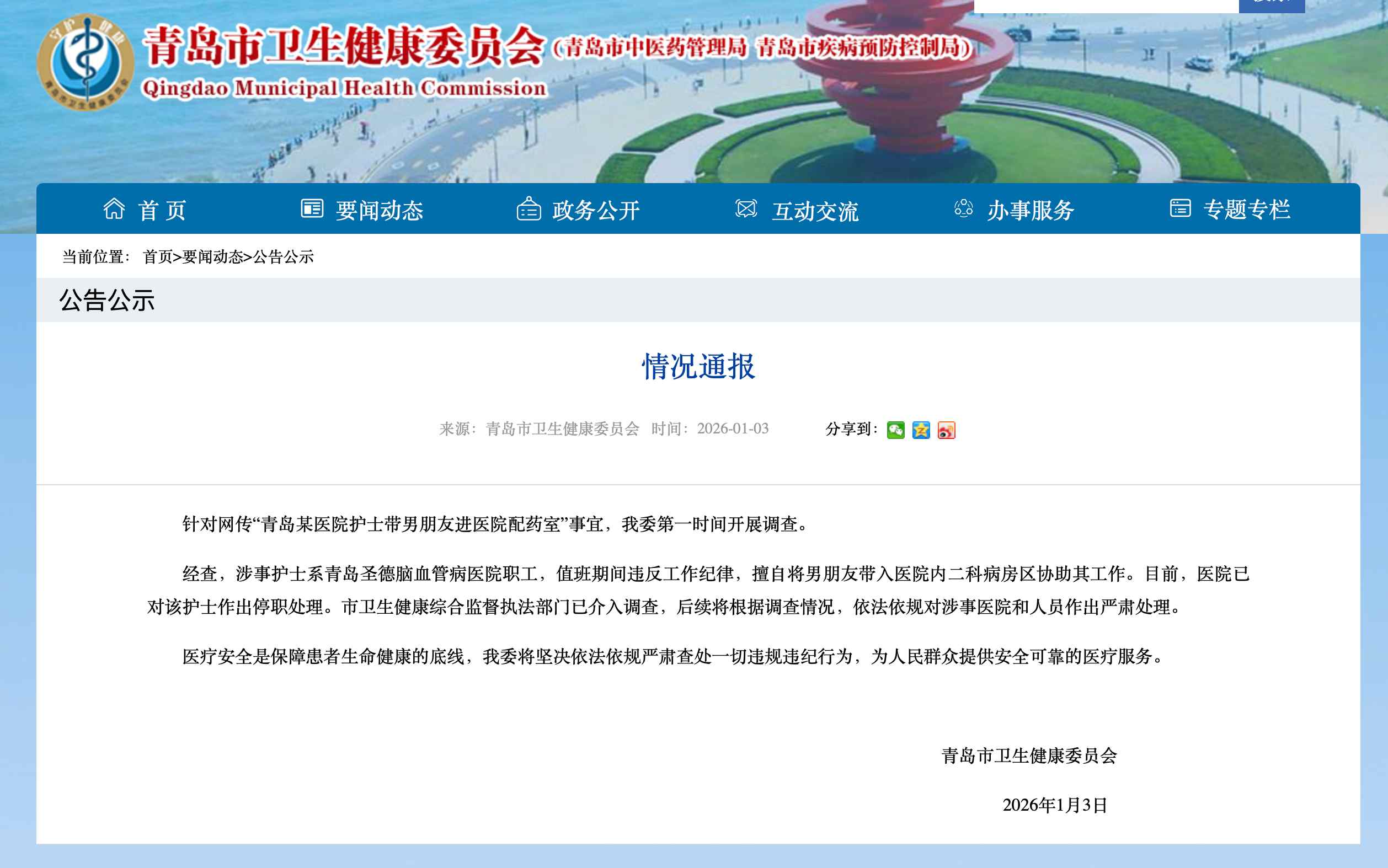 中國網(wǎng)1月3日訊 1月3日,青島市衛(wèi)生健康委員會發(fā)布情況通報:針對網(wǎng)傳“青島某醫(yī)院護士帶男朋友進醫(yī)院配藥室”事宜,青島市衛(wèi)生健康委第一時間開展調(diào)查。