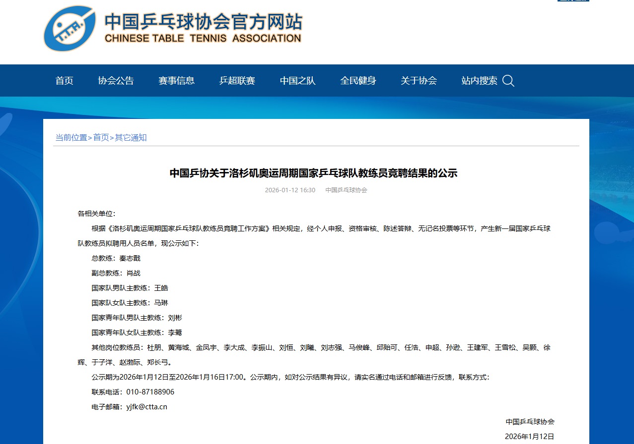 新華社北京1月12日電 中國乒協(xié)官網(wǎng)12日公示洛杉磯奧運周期國家乒乓球隊教練員競聘結(jié)果,擬聘秦志戩為總教練、肖戰(zhàn)為副總教練。