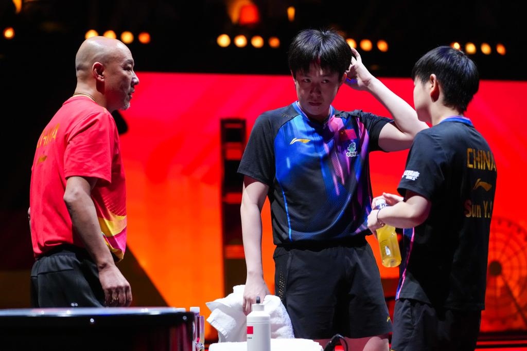 2025年12月12日,中國隊教練肖戰(zhàn)(左)在比賽暫停時指導王楚欽(中)/孫穎莎。當日,在香港進行的2025年世界乒乓球職業(yè)大聯(lián)盟(WTT)總決賽混雙小組賽中,中國組合王楚欽/孫穎莎3比2戰(zhàn)勝中國香港組合黃鎮(zhèn)廷/杜凱琹。新華社記者 朱煒 攝
