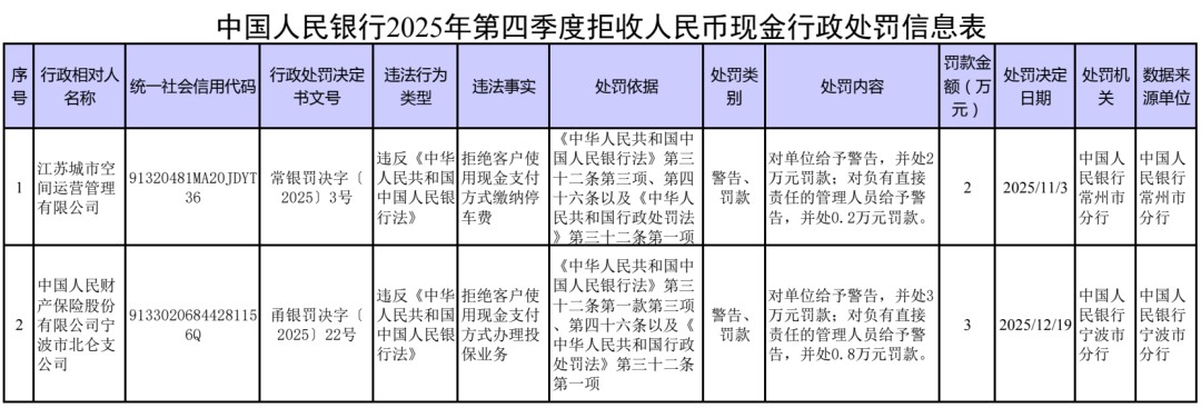 據(jù)中國人民銀行微信公眾號(hào)消息,2025年第四季度,中國人民銀行對(duì)2家核實(shí)為拒收人民幣現(xiàn)金的單位及相關(guān)責(zé)任人依法作出經(jīng)濟(jì)處罰。廣大經(jīng)營主體應(yīng)強(qiáng)化法治觀念,尊重公眾支付選擇權(quán),共同打造和諧現(xiàn)金流通環(huán)境。