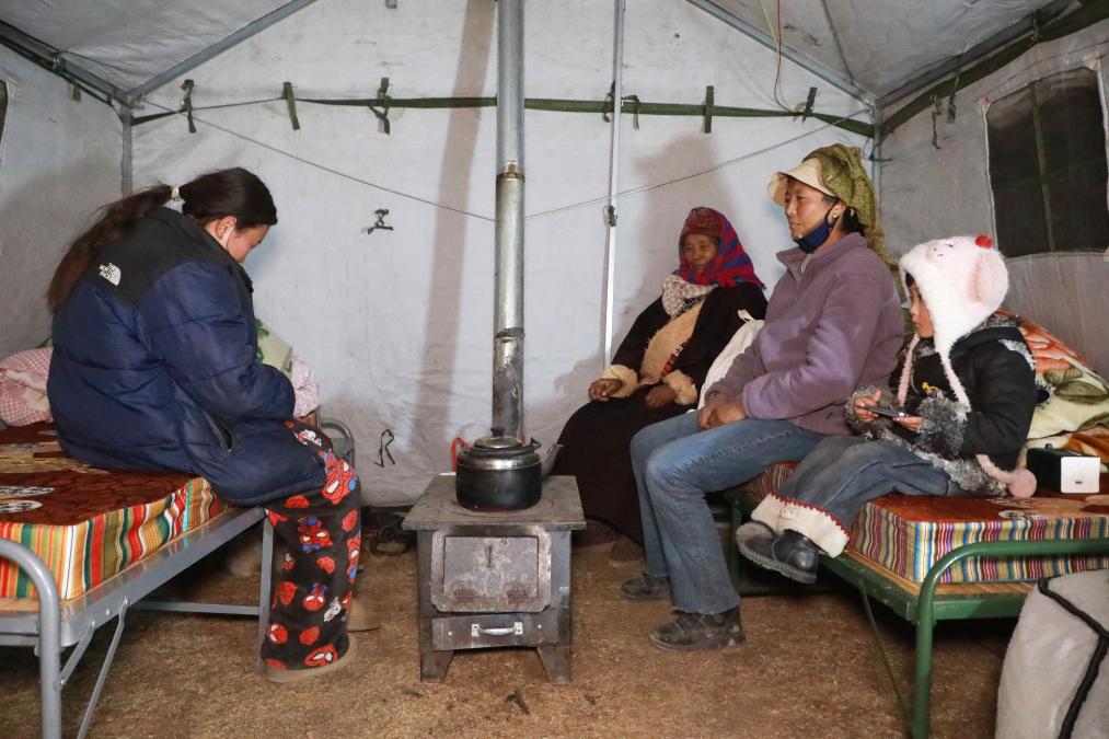 1月26日晚,在甘南州迭部縣電尕鎮(zhèn)哇曲村臨時安置點(diǎn),群眾在應(yīng)急帳篷內(nèi)取暖休息。 (新華社記者張智敏 攝)