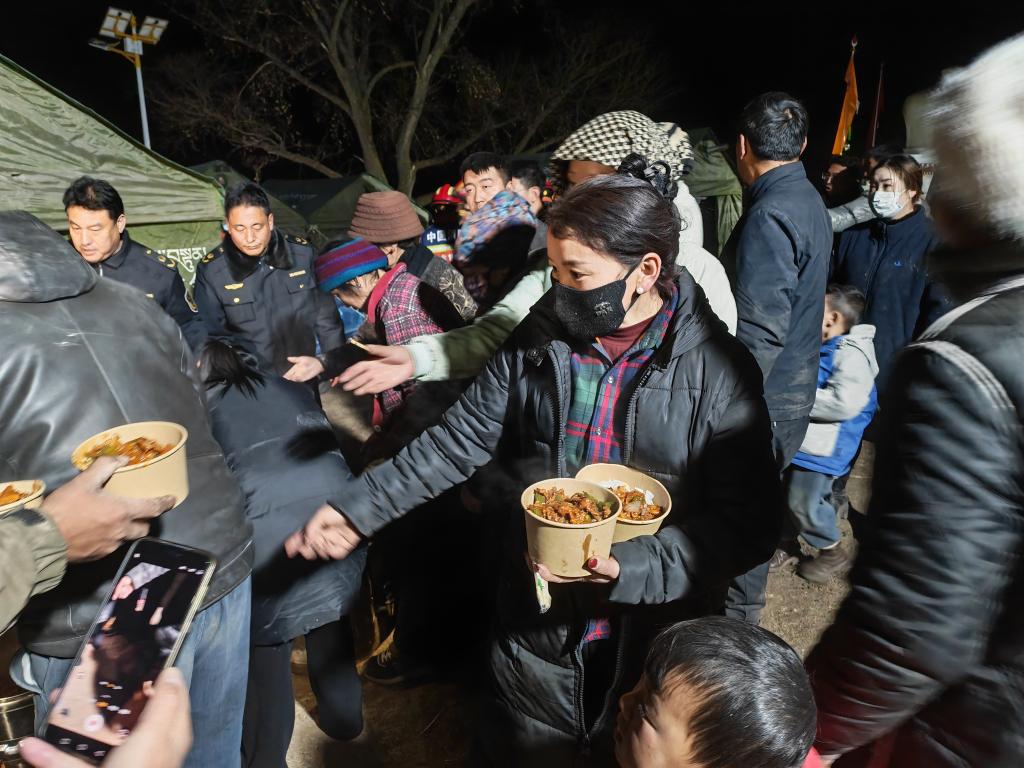 1月26日晚,在甘南州迭部縣電尕鎮(zhèn)哇曲村臨時安置點(diǎn),群眾正在領(lǐng)取愛心餐食。(新華社記者崔翰超 攝)