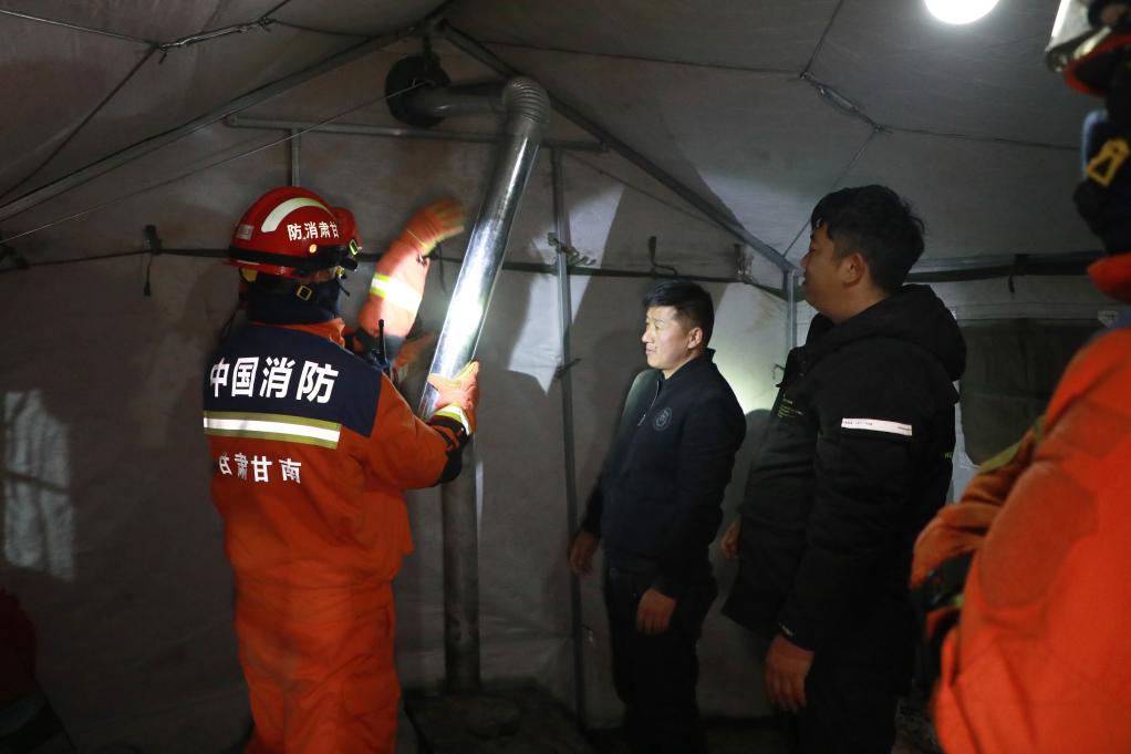 1月26日晚,在甘南州迭部縣電尕鎮(zhèn)哇曲村臨時安置點(diǎn),消防救援人員在應(yīng)急帳篷內(nèi)幫助群眾安裝煤爐煙筒。 (新華社記者張智敏 攝)